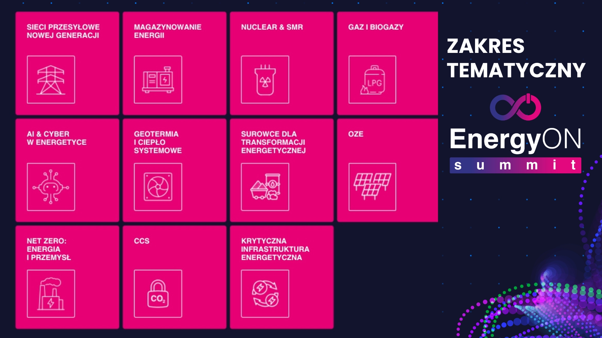 EnergyON Summit to jedno z najważniejszych i największych wydarzeń biznesowych poświęconych transformacji energetycznej oraz dekarbonizacji przemysłu w Europie Środkowo-Wschodniej. Przyciąga uwagę przedstawicieli przemysłu, ekspertów, liderów rynku, decydentów i innowatorów. Poprzednie edycje (H2POLAND oraz NetZero Energy) zyskały reputację skutecznego narzędzia wspierającego dialog między sektorem energetycznym, przemysłem, światem nauki i administracją.