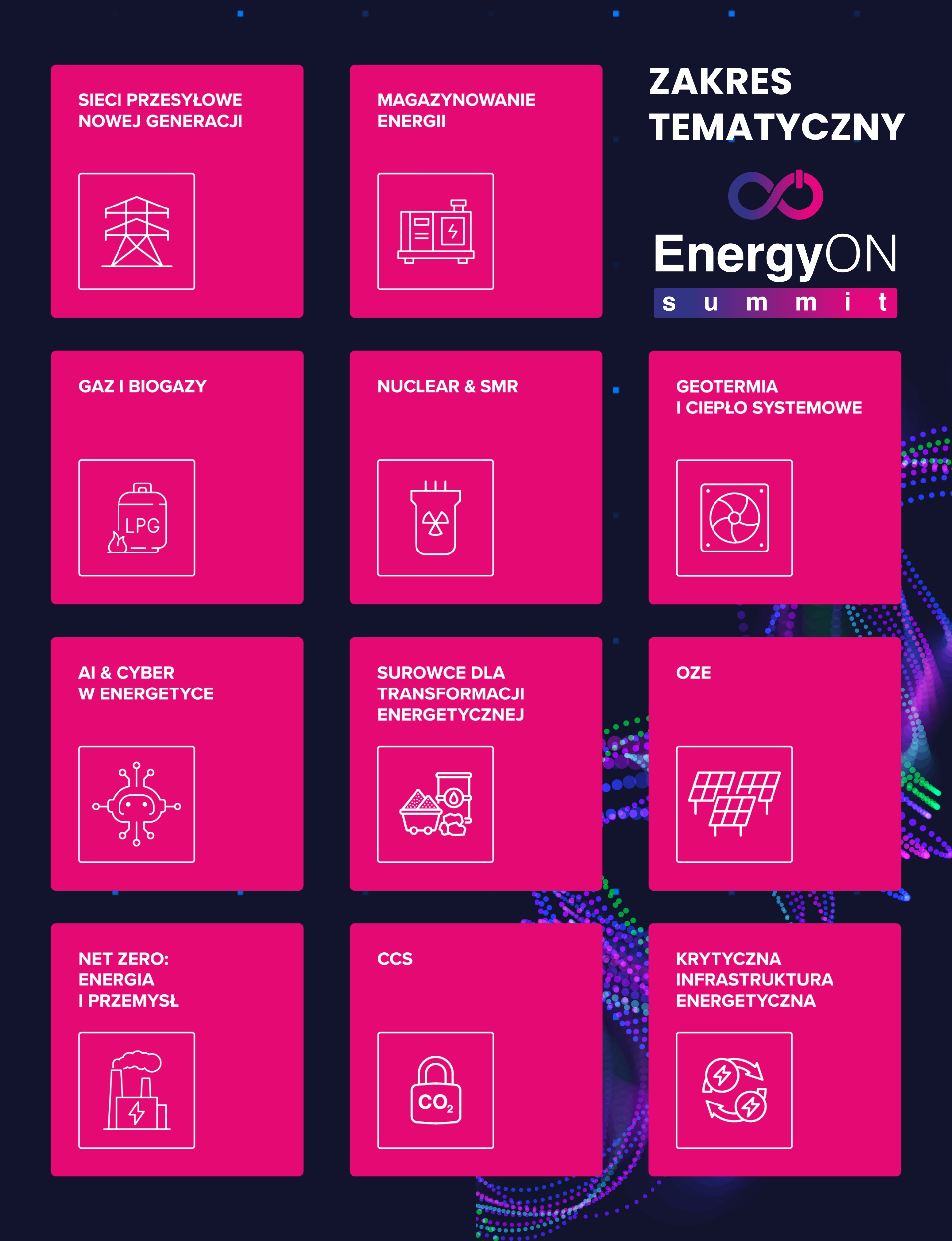 EnergyON Summit to wydarzenie w formule konferencyjno-wystawienniczej poświęcone kluczowym kierunkom transformacji energetycznej i dekarbonizacji przemysłu. EnergyON Summit to także miejsce spotkań liderów sektora, decydentów, ekspertów i dostawców innowacyjnych rozwiązań dla energetyki przyszłości.