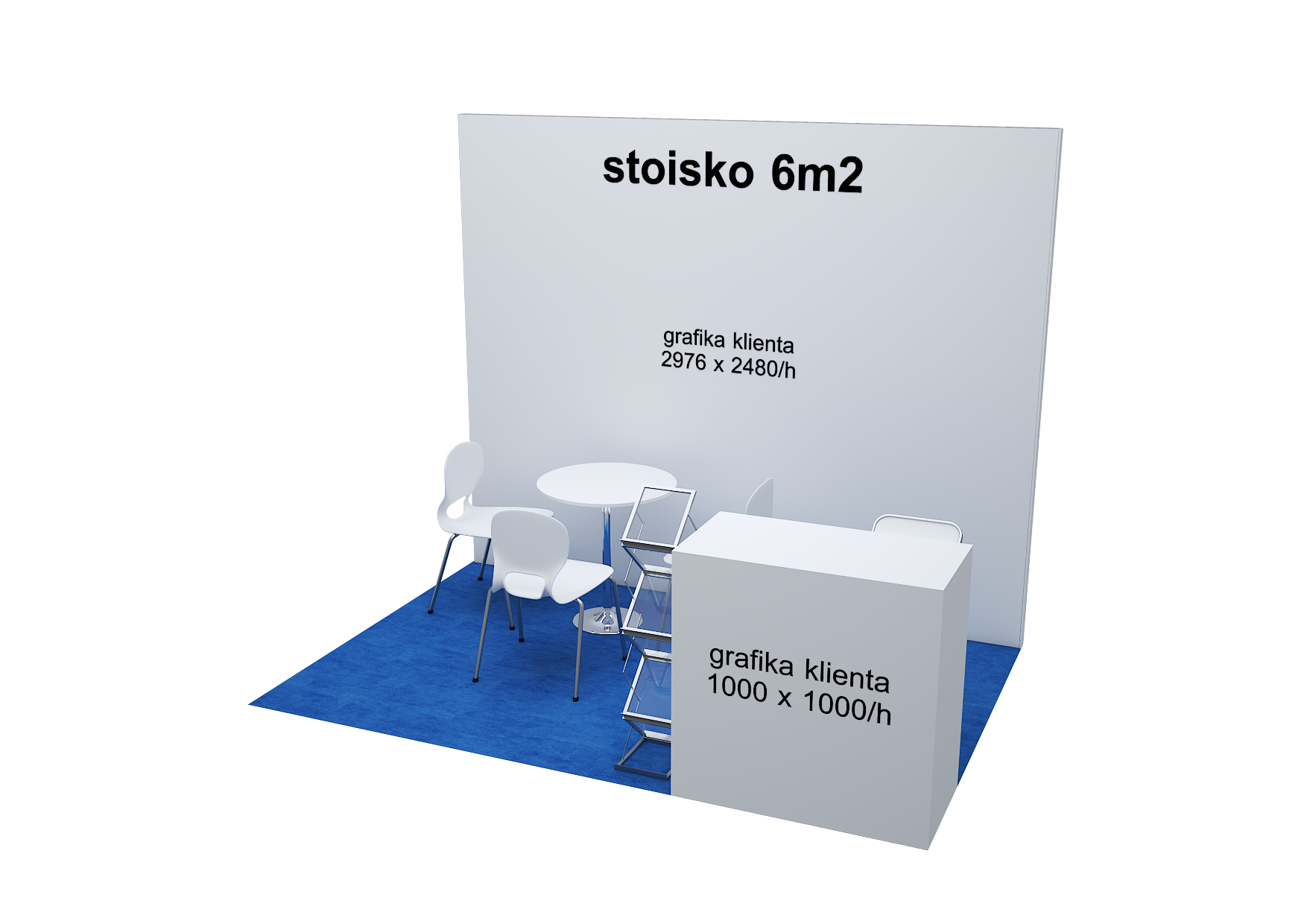 - stoisko 6 m2/ półwyspowe - 1 ścianka o wymiarach 2976 x 2480/h + lada 1000 x 1000/h