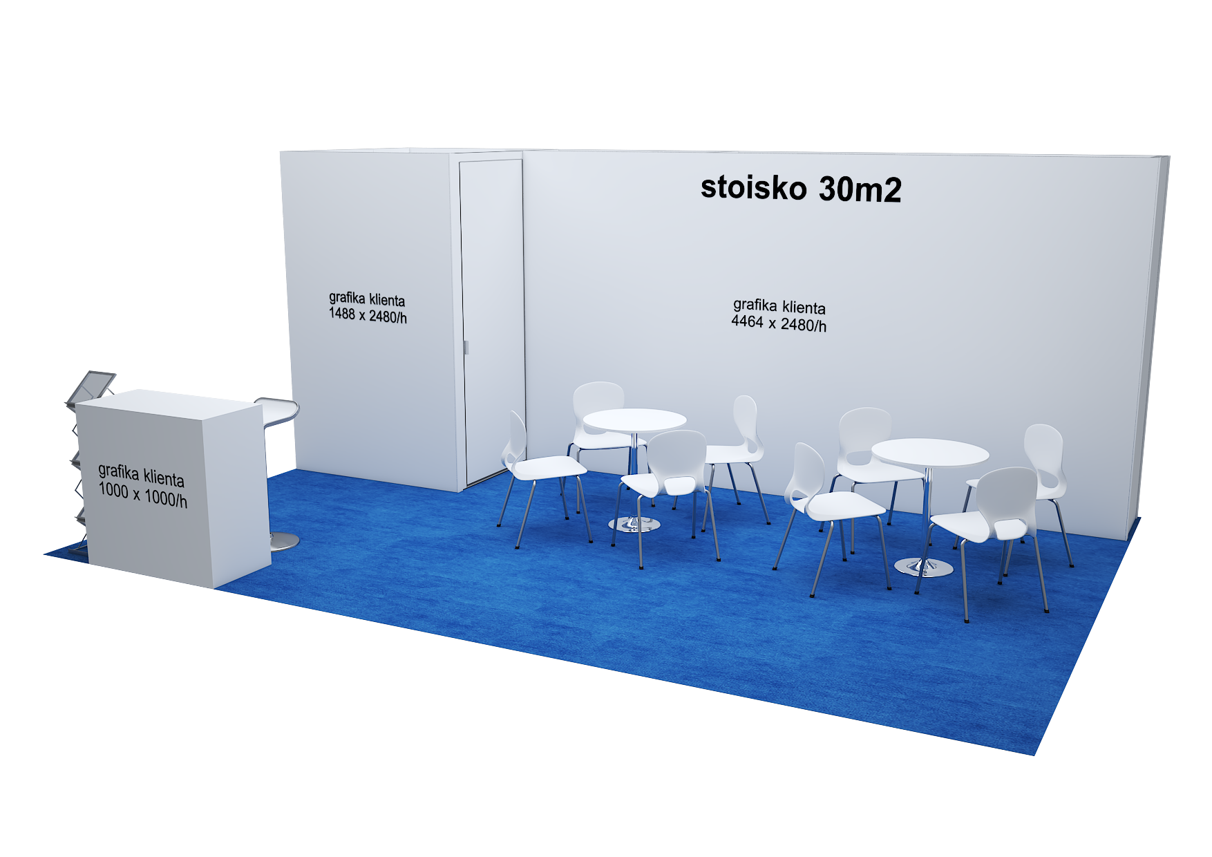 - stoisko 9 m2/ półwyspowe- 1 ścianka o wymiarach 2976 x 2480/h + lada 1000 x 1000/h